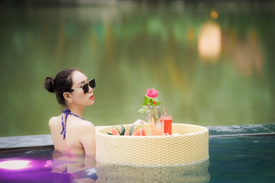 ghế dài thưởng thức các món nước uống hấp dẫn, tham gia các hoạt động bơi thư giãn tinh thần và ngắm nhìn thiên
