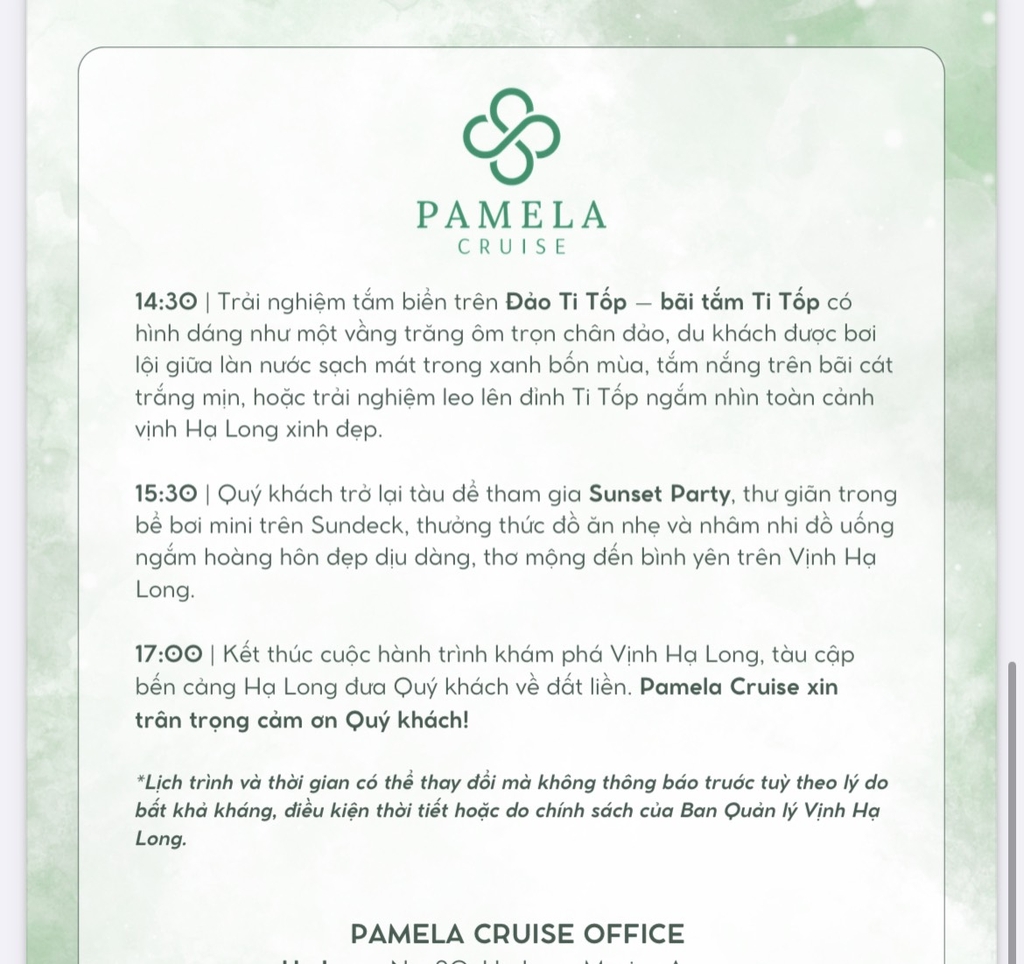 Pamela cruise đưa du khách đến các điểm tham quan nổi tiếng tại Hạ Long như đảo Ti Tốp, hang Sửng Sốt, và nhiều trải nghiệm hấp dẫn như: trèo thuyền kayak hoặc đi đò nan, tham gia tiệc trà chiều hoàng hôn, cùng nhiều dịch vụ thú vị khác. Hay cùng Onevivu khám phá tour du thuyền này nhé !!!