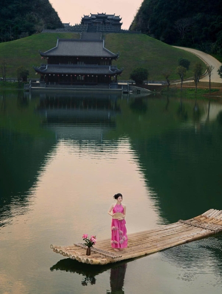 Nhà cổ rêu phong: Những nếp nhà gỗ mái ngói mũi hài soi bóng xuống dòng hồ, tái hiện lại Hành cung Hoa Lư uy nghiêm.
